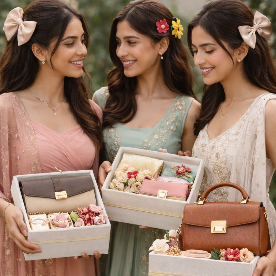 Neelanjali Hampers offers an exclusive range of curated gift hampers, stylish accessories, and ready-to-gift combinations designed for modern, thoughtful gifting. Our assortments include premium handbags, chic clutches, charming hair accessories, and coordinated gifting sets — selected for visual appeal, functionality, and fine craftsmanship.